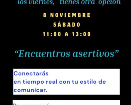 En palabras de Ana, en estos encuentros mensuales (1 viernes al mes) «Aprenderemos técnicas para hablar en nuestro día a día, con soltura, de forma directa y también respetuosa y también Claves para peparar tu CV con el toque mágico de la asertividad». Experimentaremos el estilo de comunicación que nos perjudica: -Verbal -No verbal -No verbal NO consciente -Gestual -Postural Anímate» Y también, Reservas 688635412 / Osina Ekogunea, c/Donostia 15, bajo